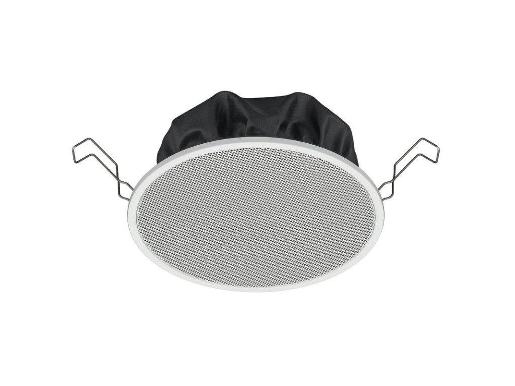 Stropný širokopásmový reproduktor 6 W / 100 V, odbočky 6 W, 3 W, 1,5 W a 0,8 W, citlivosť 94 dB (1 W / 1 m, 500 Hz – 5 kHz), frekvenčný rozsah 80 Hz – 20 kHz, vyžarovací uhol 175° (1 kHz), reproduktor 120 mm, snap-in svorkovnica, kovová mriežka, vonkajší priemer 180 mm, montážny otvor 156 mm, kryt proti kvapkajúcej vode, vnútorné použitie typ A, biely, pružinová montáž do podhľadu, IP 21C, EN 54-24