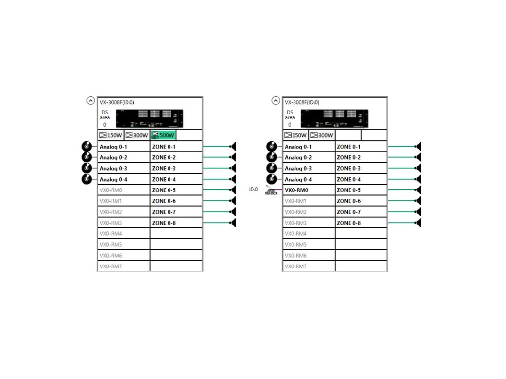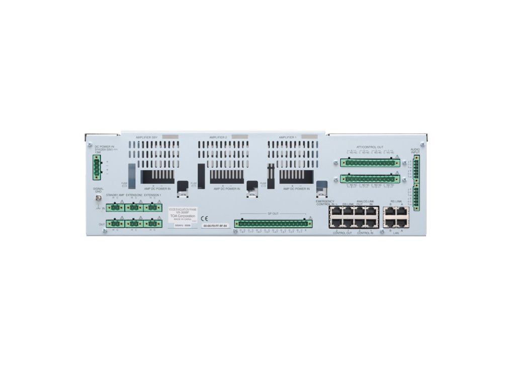 Riadiaca jednotka systému HSP TOA VX-3000, má v ráme 2x slot pre zosilňovač + 1x záložný, umožňuje pripojiť 8 reproduktorových liniek, max. možný inštalovaný výkon 2x 500 W + 1x 500 W záloha, 4x audio vstup, 2x RM port pre mikrofóny (na každý max. 4 ks), 16 ovládacích vstupov, pripojenie cez LAN, napájanie 31 V DC, rozmery 483 x 133 x 345 mm, EN 54-16