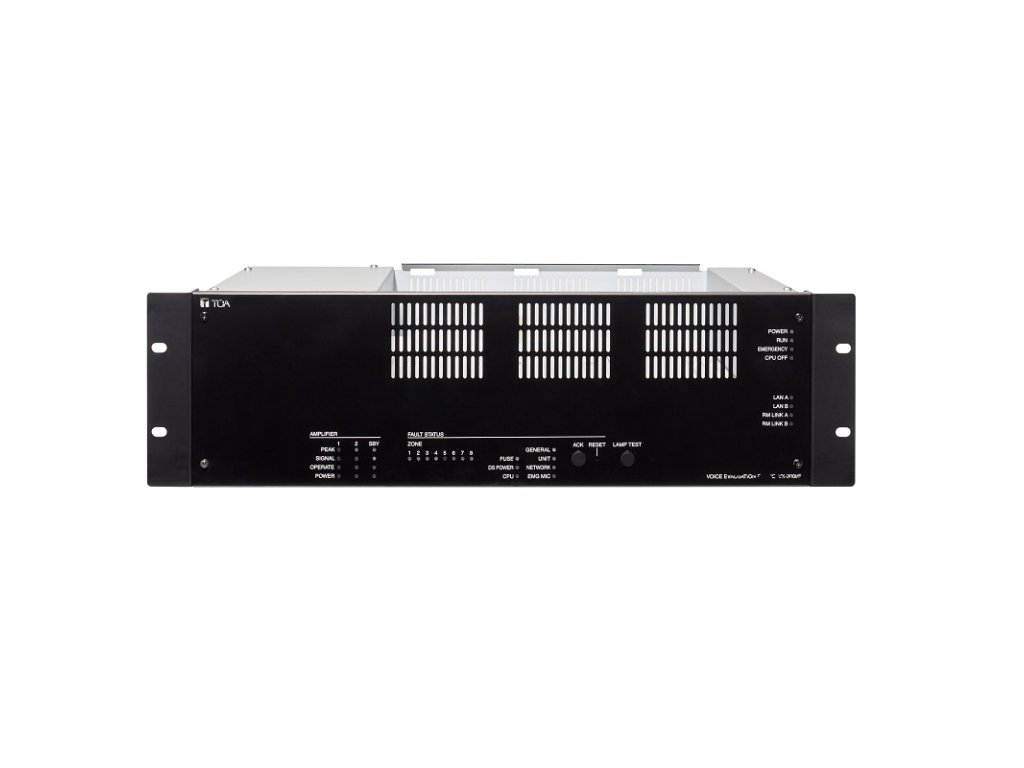 Riadiaca jednotka systému HSP TOA VX-3000, má v ráme 2x slot pre zosilňovač + 1x záložný, umožňuje pripojiť 8 reproduktorových liniek, max. možný inštalovaný výkon 2x 500 W + 1x 500 W záloha, 4x audio vstup, 2x RM port pre mikrofóny (na každý max. 4 ks), 16 ovládacích vstupov, pripojenie cez LAN, napájanie 31 V DC, rozmery 483 x 133 x 345 mm, EN 54-16