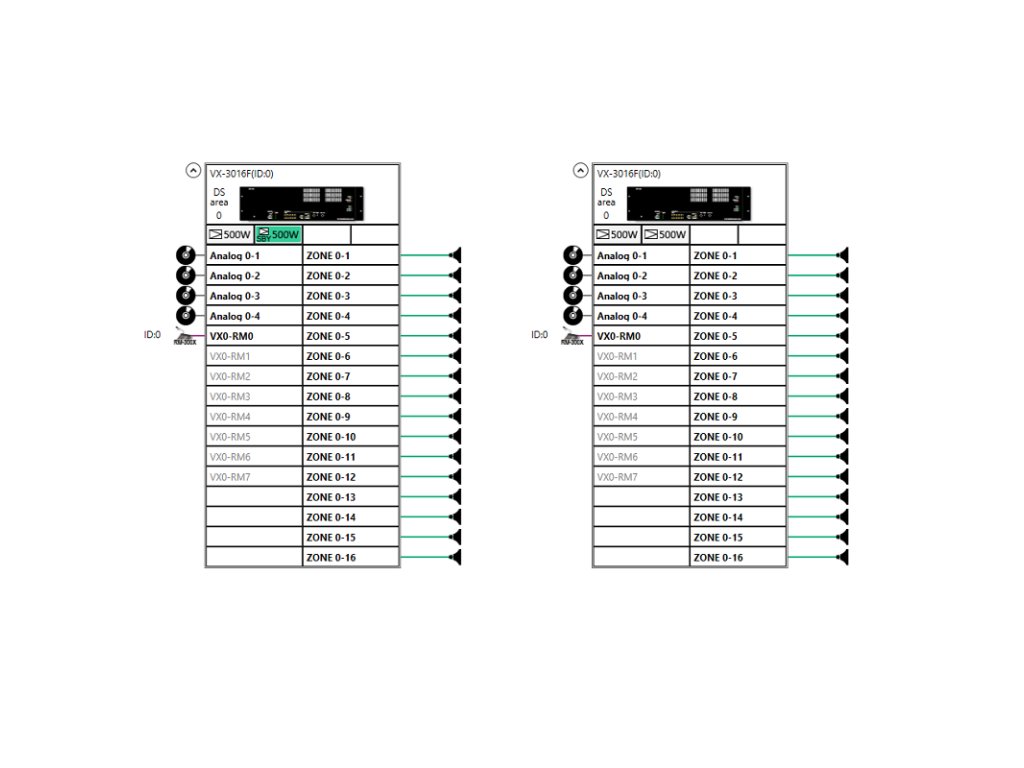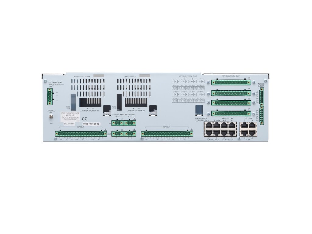 Riadiaca jednotka systému HSP TOA VX-3000, má v ráme 2x slot pre zosilňovač, umožňuje pripojiť 16 reproduktorových liniek, max. možný inštalovaný výkon 2x 500 W, 4 x audio vstup, 2x RM port pre mikrofón (na každý max. 4 ks), 16 ovládacích vstupov, pripojenie cez LAN, napájanie 31 V DC, rozmery 483 x 133 x 345 mm, EN 54-16