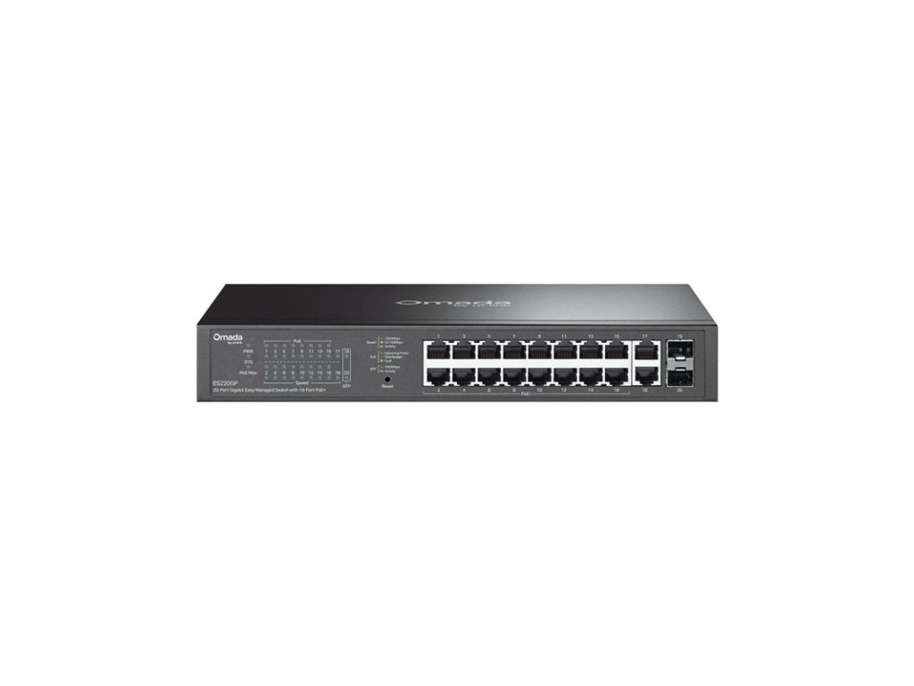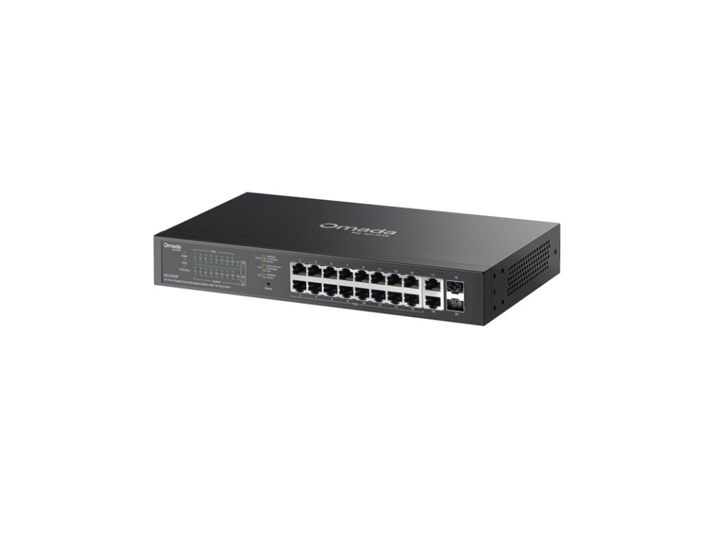 20 portový PoE L2 switch, 18x 10/100/1000 Mbps RJ-45 PoE (IEEE 802.3af/at 15/30W), 2x SFP port, PoE max. 250 W, PoE s dosahom do 250 m, PoE auto recovery; Switching Capacity 40 Gbps; Packet Forwarding Rate: 29,76 Mbps, MAC Address Table 8K, Packet Buffer Memory 4 Mbit, Jumbo Frame 15 KB; Omada, pracovná teplota od -5 °C do 50 °C, napájanie 100-240 VAC, 50/60 Hz, rozmery 294 × 180 × 44 mm, ochrana pred prepätím 6 kV.