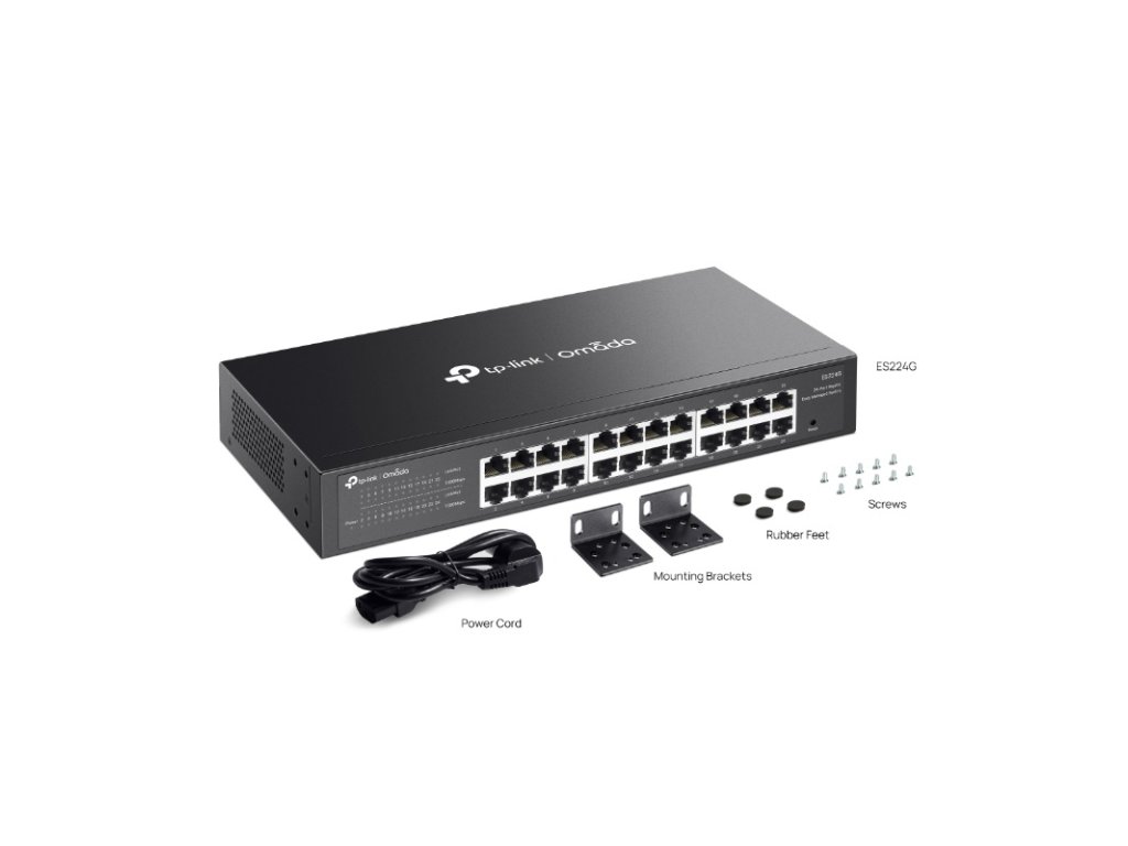 24portový manažovatelný L2 switch, 24× 10/100/1000 Mb/s RJ45; Switching Capacity 48 Gbps; Packet Forwarding Rate: 35,7 Mbps, MAC Address Table 8K, Packet Buffer Memory 4 Mbit, Jumbo Frame 15 KB; Omada Cloud a webové rozhranie, pracovná teplota od -5 °C do 50 °C, napájanie 100-240 V AC 50/60 Hz, rozmery 294 × 140 × 44 mm, prepäťová ochrana 6 kV