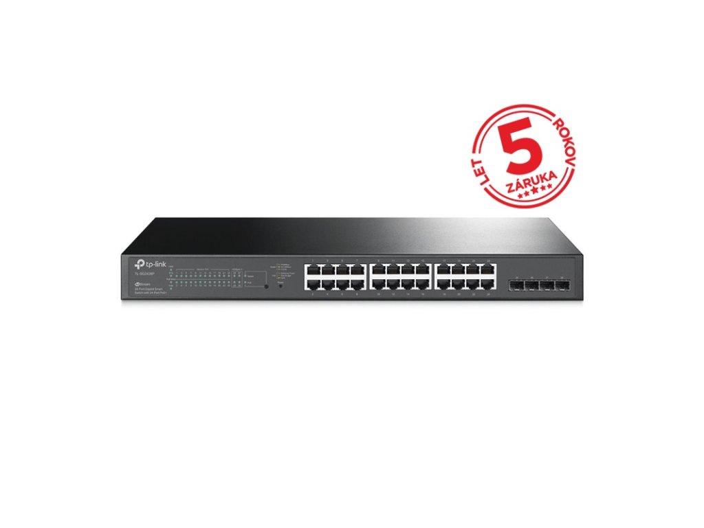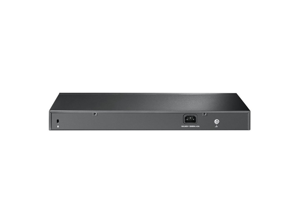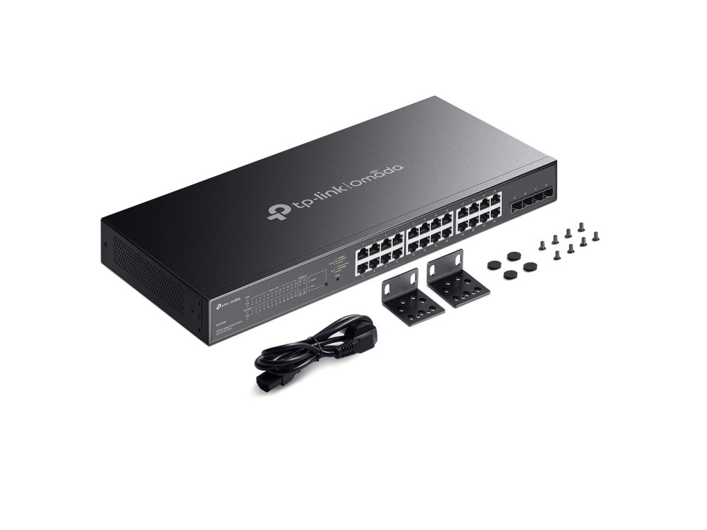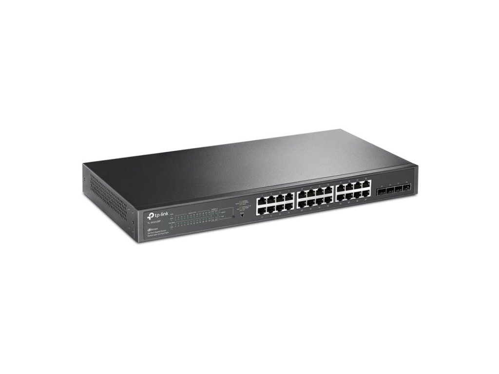 TP-Link switch 24x 10/100/1000 Mb/s, 4x SFP, podpora PoE pre 24 portov, 24x PoE+ (IEEE802.3), celkovo na všetky porty max. 250 W, jeden port max. 30 W, pracovná teplota od 0 °C do +50 °C, rozmery 440 × 220 × 44 mm