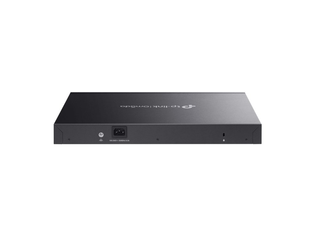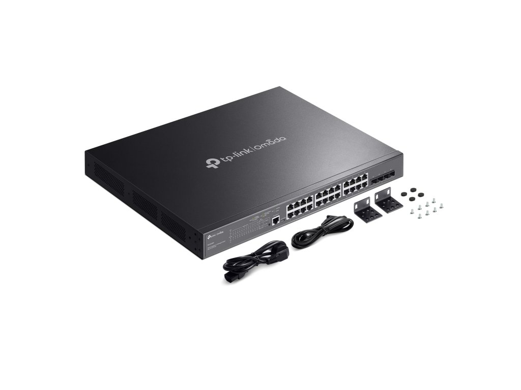 Switch so 24 PoE+ gigabitovými portami RJ-45 a 4 gigabitové SFP porty, PoE+ 30 W (IEEE 802.3at), maximálne 384 W spolu na všetky porty. Switching Capacity 56 Gbps, 8 priority queues, Funkcie: ACL, ochrana proti DoS, storm control, DHCP server, DHCP relay, DHCP interface relay, DHCP L2 Relay, DHCP VLAN relay, DHCP Snooping, IP-MAC-Port Binding, IGMP snooping, web GUI, CLI, telnet, SSH, SNMP, RMON, QoS, VLAN, Omada, pracovná teplota od 0 °C do +40 °C, napájanie 100–240 V AC 50/60 Hz, spotreba max. 456,4 W, montáž do racku, rozmery 440 × 330 × 44 mm