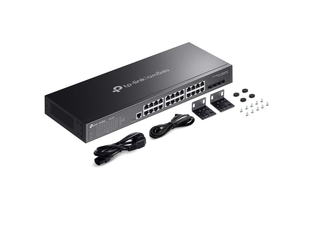 28portový manažovatelný L3 switch, 24× 10/100/1000/2500 Mb/s RJ-45, 4x 10 000 Mb/s SFP+, 1x RJ-45 Console port, 1x Micro USB Console port; Switching Capacity 128 Gbps; Packet Forwarding Rate: 95,23 Mbps, MAC Address Table 16K, Packet Buffer Memory 12 Mbit, Jumbo Frame 9 KB; Omada Cloud a webové rozhranie, pracovná teplota od 0 °C do 45 °C, napájanie 100-240 V AC, 50/60 A, spotreba max. 23,6 W, rozmery 440 × 180 × 44 mm